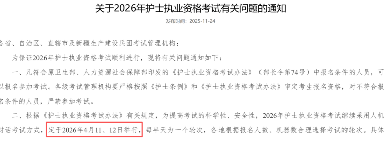 整体稳定在4月下旬,不会有太大的变化。此外,11月24日,国家卫生健康委人才交流服务中心发布了2026年护士执业资格考试时间,将在2026年4月11日至12日举行。