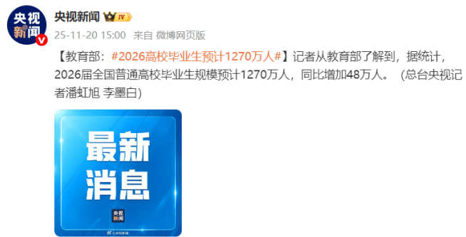 11月20日央视新闻发布2026届全国普通高校毕业生规模预计1270万人,同比增加了48万人。这样庞大的数字,宝子们是不是有点慌?开始担心26年专升本竞争会不会增加呢?
