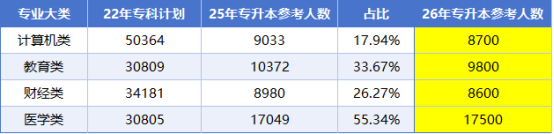 根据25年专升本参考人数占比推测26年这四类专业的考试人数: