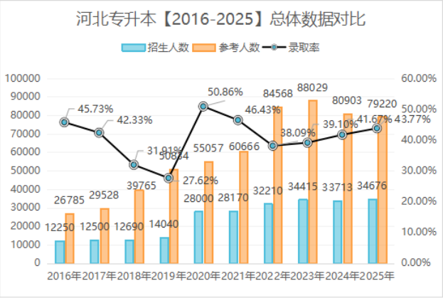 此数据为2016-2025年河北专升本招生人数和参考人数的对比图。可以看到,在2022年,参加河北专升本的考生直线上升,比21年增加了将近2.4万人,2023年考试人数达到顶峰,此后基本平均在8万人左右。